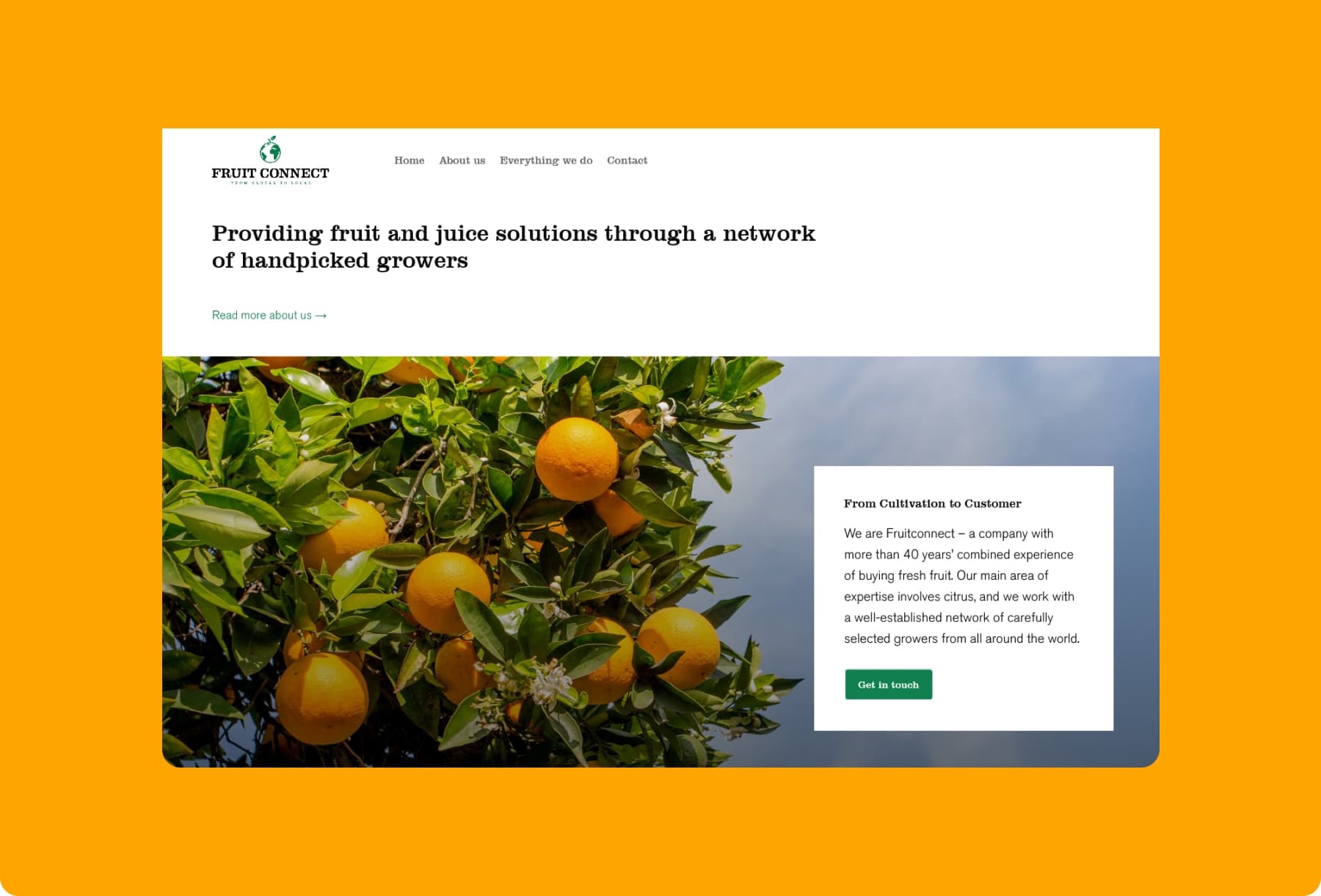 I designen har vi använt Fruitconnects egna, smaragdgröna färg och kombinerat den med en djupare orange ton och små accenter av cyan. Kombinationen ger webbplatsen ett professionellt uttryck (och matchar således målgruppens förväntningar) och för associationerna till företagets produkter/tjänster. Därtill har fonterna Clarendon och Akzidenz Grotesk använts, en blandning mellan kraftiga seriffer i rubrikerna och en lättläst brödtext.
